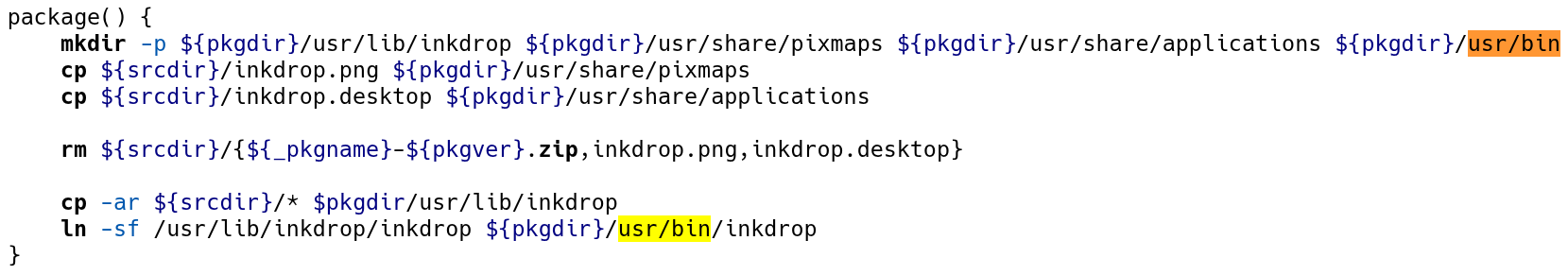 I’ve analyzed archlinux PKGBUILD from AUR. The community is not even using the usr/bin folder but linking directly to the one in lib/inkdrop.