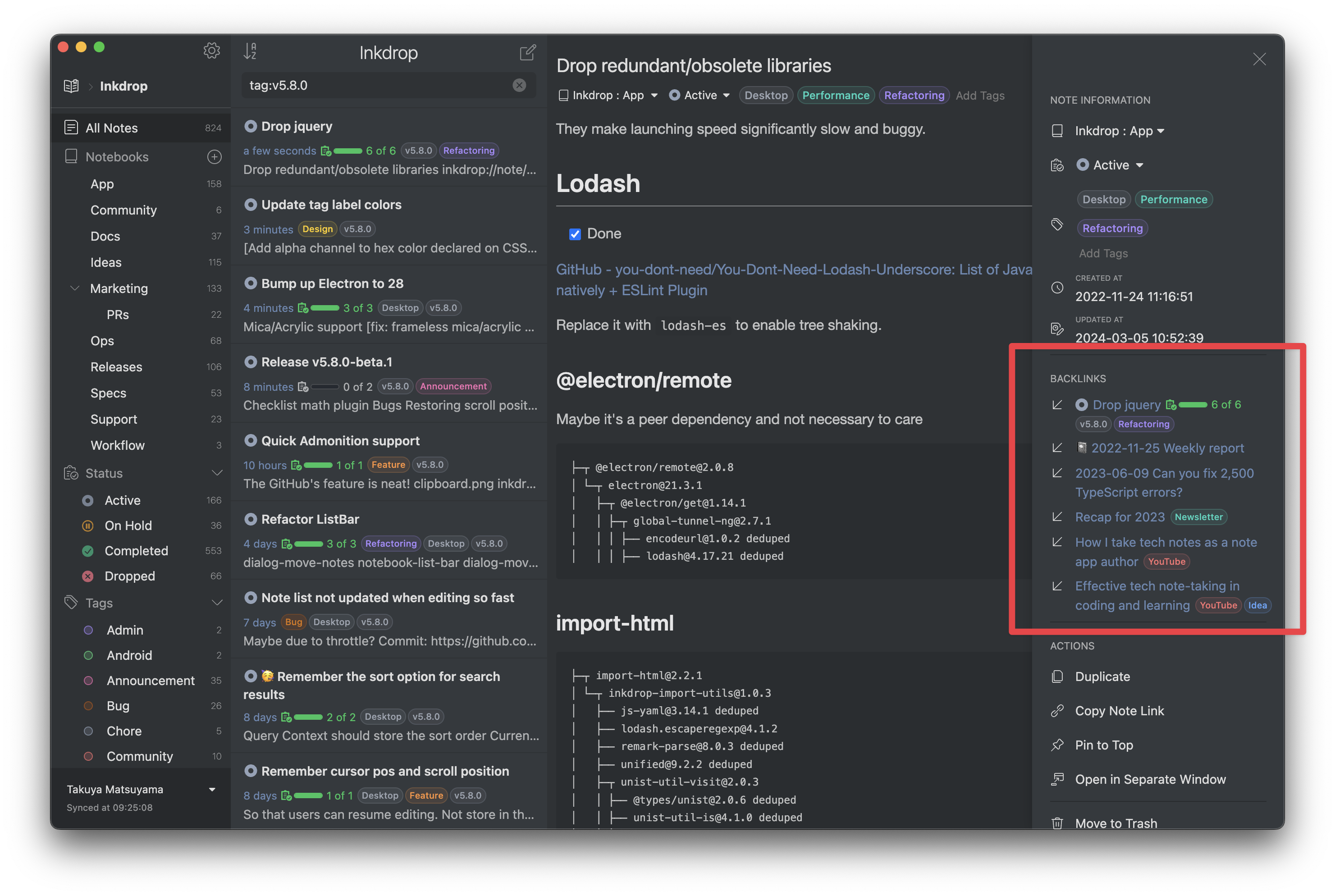 For example, some notes are tagged with ‘v5.8.0’. Currently, the note list displays all the notes in a workspace of the notebook ‘Inkdrop’, ordered by last modification dates in descending order. You want to filter notes by the tag by clicking it on the note list item.