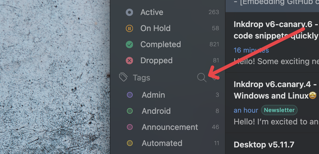 Shortcut search buttons have been added to the notebook and tag sections in the sidebar, allowing you to quickly launch Telescope and narrow down items by keyword.