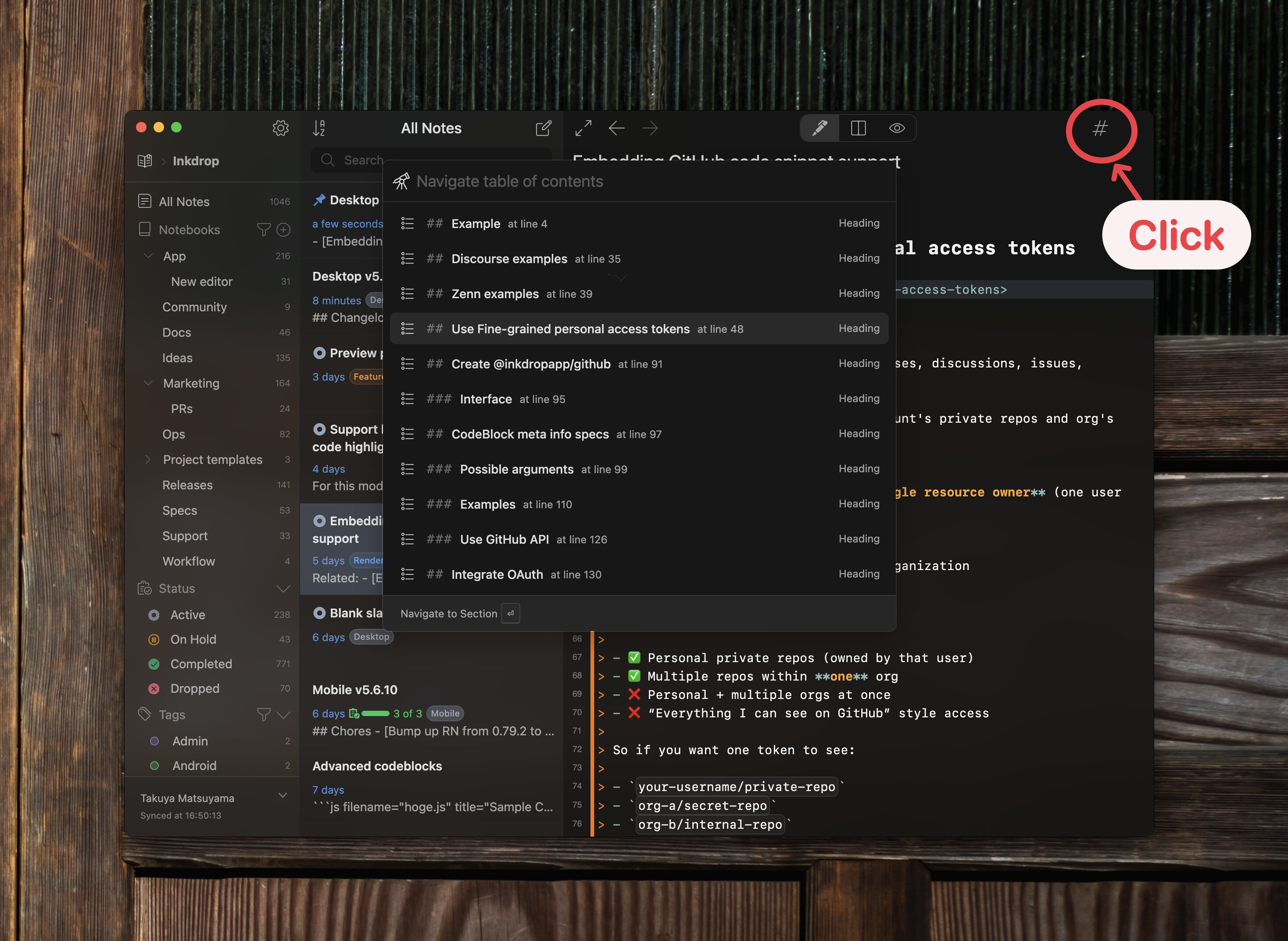 When writing a long note, you may want to jump between sections or get an overview of the entire structure.
