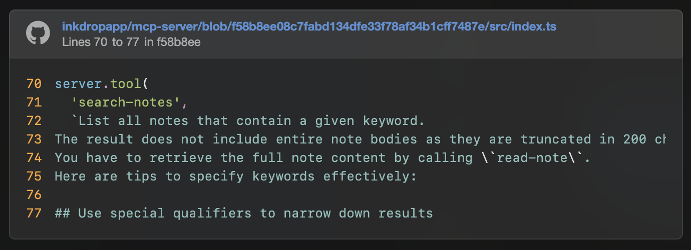 For example, when browsing Inkdrop’s MCP server, you can select a range of code on GitHub by clicking a line number, then holding Shift and clicking another line number.