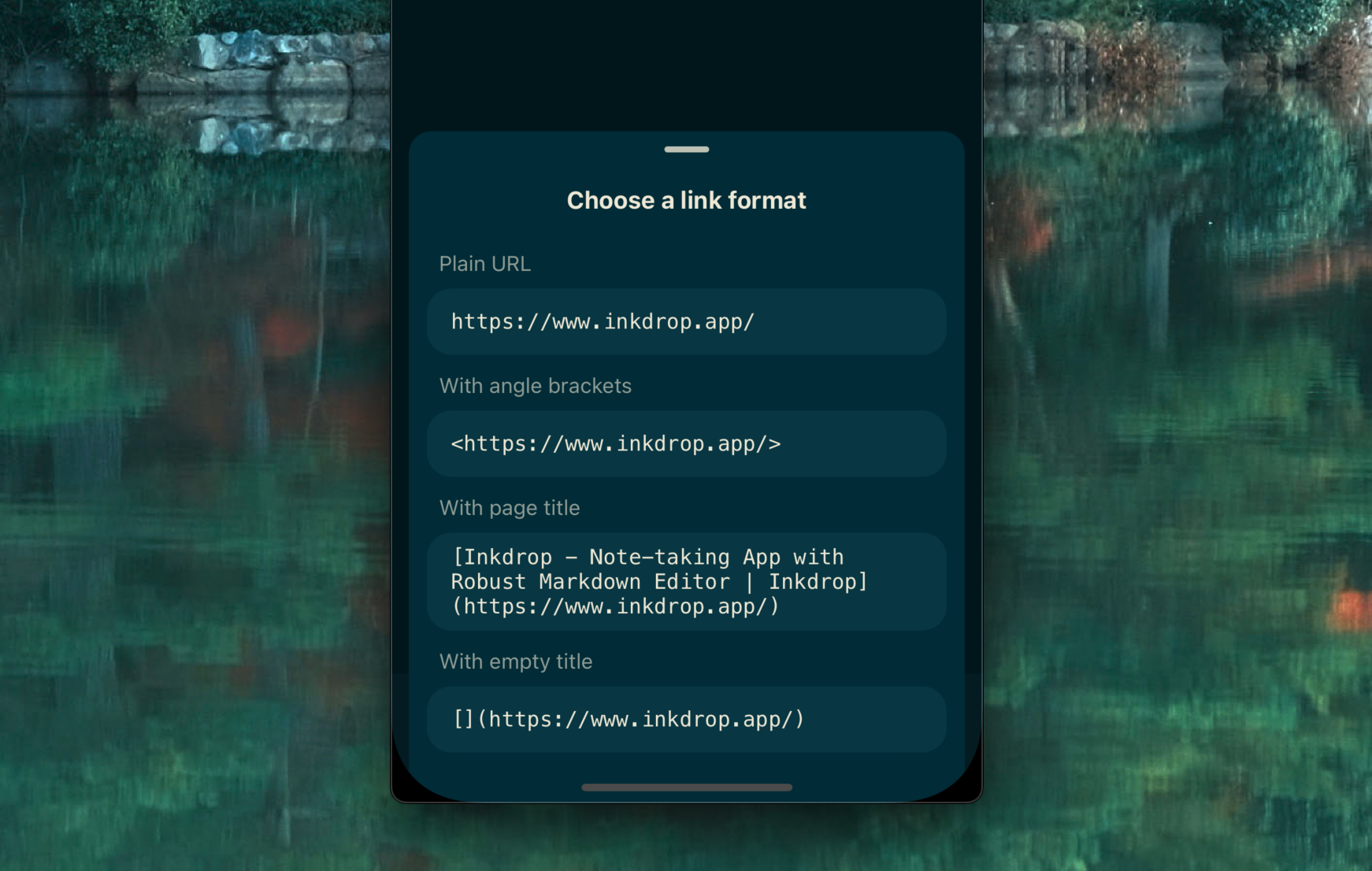 You often want to insert links that you find on the web, but it is annoying to add titles of them. Inkdrop now automatically fetches the page titles. You can choose a link format as you like.