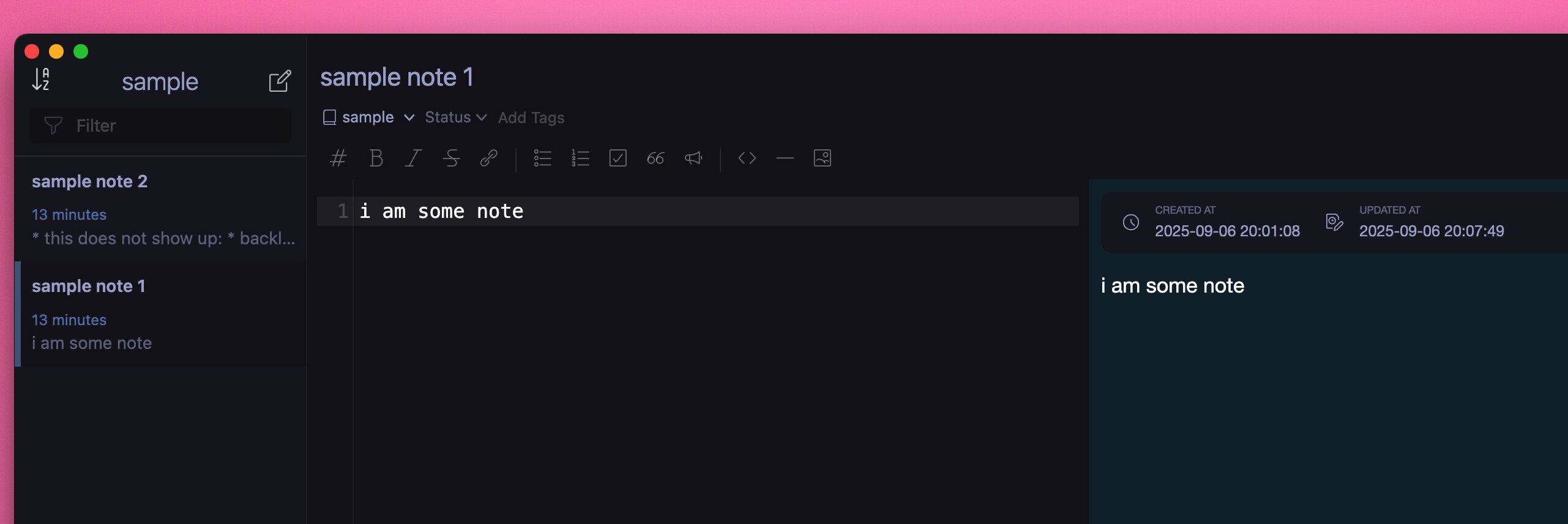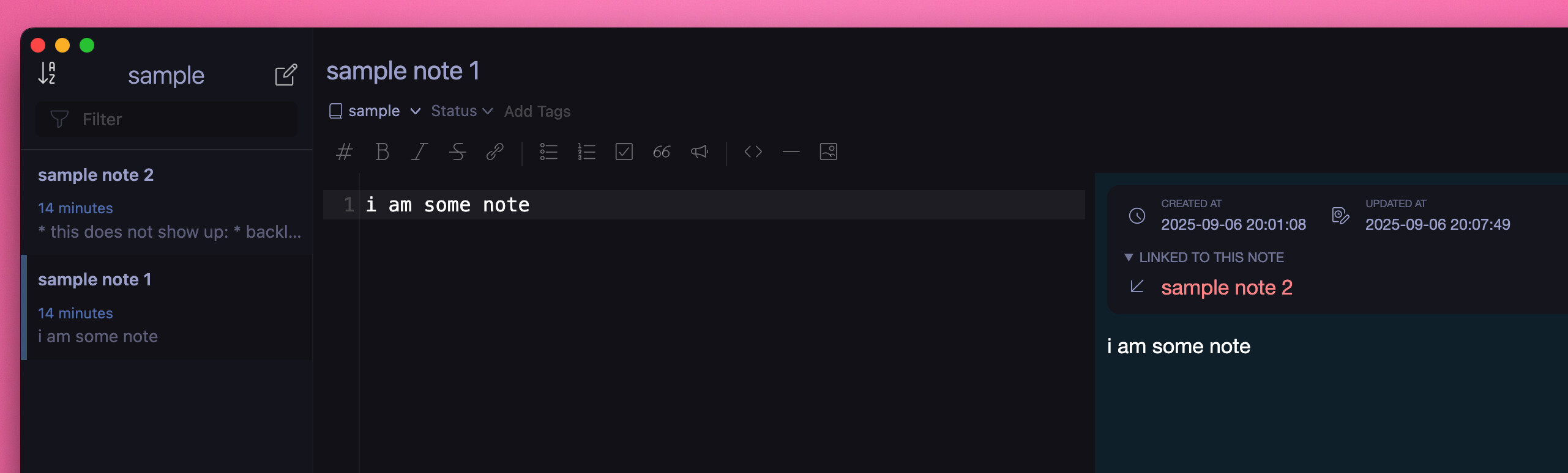 Notice no notes are listed under Linked to this note (the backlinks section) on note 1